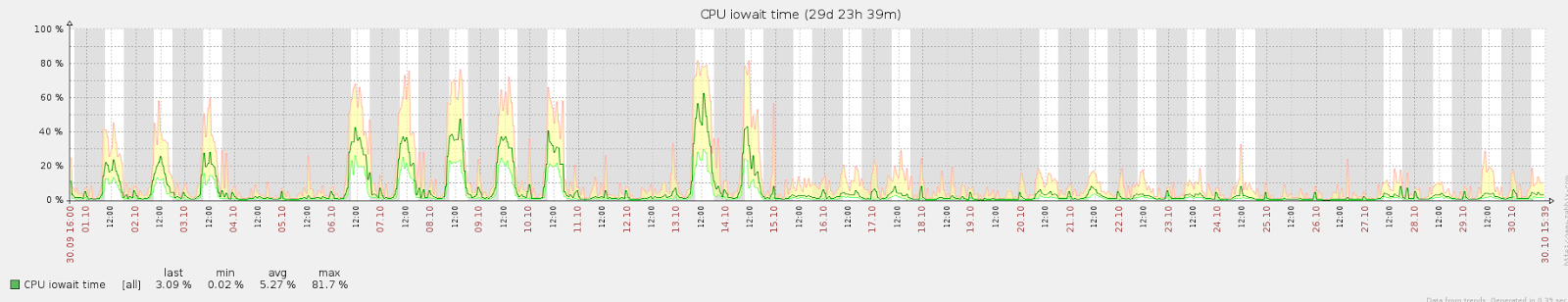 По умолчанию под pagecache выделяется почти вся незанятая процессами память, поэтому увеличить его объём можно лишь установкой дополнительных планок RAM. Однако память — недорогой по сравнению с ЦПУ и дисками ресурс, при этом эффект от увеличения кэша может привести к значительному увеличению производительности. Ниже представлен график %iowait — доли времени, в течение которого ЦПУ ожидает ввода/вывода. График снят с рабочего нагруженного сервера. Думаю, комментарии здесь излишни.