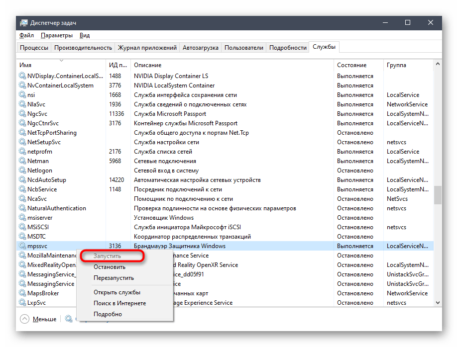 Посмотрите, работает ли эта служба. Если нет, кликните по ней ПКМ и выберите пункт «Запустить».
