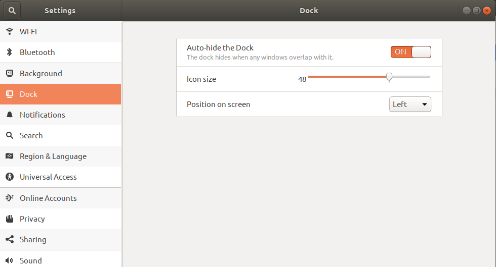 Подсказка: для избавлений от прикрепления Ubuntu по умолчанию через UI перейдите к представлению Dock от параметров настройки системы. Затем поверните Автоскрывать кнопку ползунка Прикрепления На. Таким образом, Вы будете только видеть Прикрепление, когда Вы нависнете над левой областью экрана.