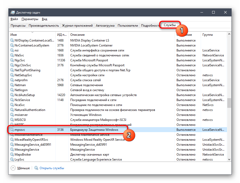 В нем переместитесь на вкладку «Службы» и найдите там «Брандмауэр Защитника Windows».