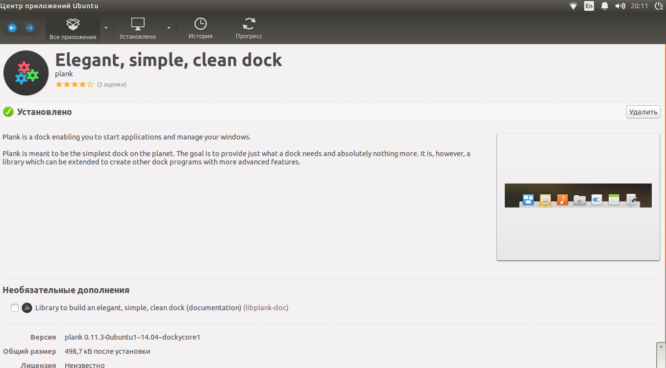 Также возможна установка plank в ubuntu из центра приложений. Уж какой способ установки вы предпочитаете, зависит лишь от вас. В synaptic он тоже присутствует.