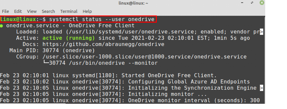 You can see that the OneDrive service is enabled and activated. Now, it will automatically synchronize all the data on the cloud server and Linux Mint machine.