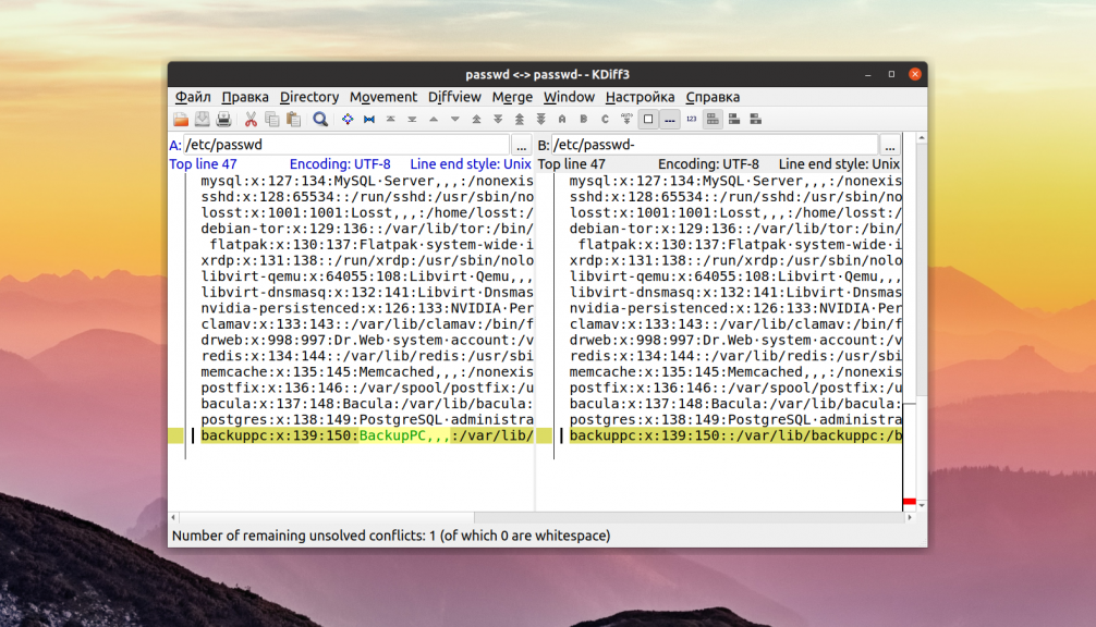KDiff3 — еще один отличный, свободный инструмент для сравнения файлов в окружении рабочего стола KDE. Он входит в набор программ KDevelop и работает на всех платформах, включая Windows и MacOS. Можно выполнить сравнение до трех файлов Linux или даже сравнить каталоги. Кроме того, есть поддержка слияния и ручного выравнивания.