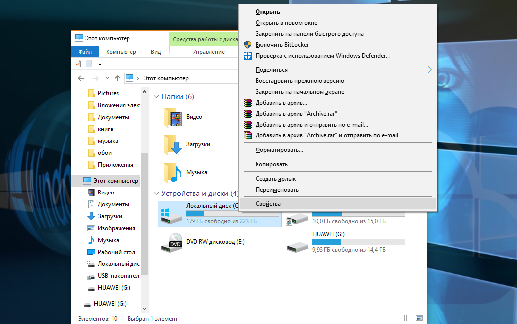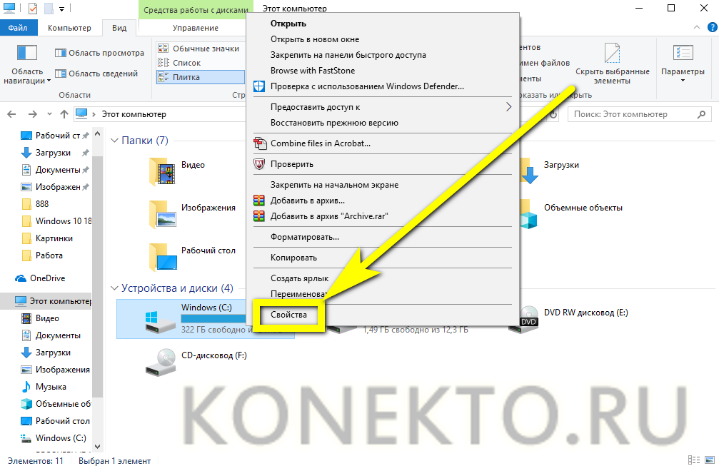 Вновь открыть меню «Этот компьютер», после чего щёлкнуть правой клавишей мыши по диску С — или любому другому, который требуется немного освободить, и выбрать в контекстном меню пункт «Свойства».