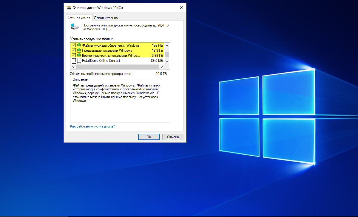 Содержимое этой директории представлено копиями системных файлов установки предыдущей версии Windows. Если вы твёрдо решили не возвращаться к старой версии системы, папку Windows.old можно удалить. Делается это опять либо с помощью cleanmgr.exe, либо с помощью командной строки. В первом случае вам нужно найти и отметить на вкладке «Дополнительно» пункт «Предыдущие установки Windows», во втором – выполнить в запущенной от имени администратора консоли CMD команду rd /s /q c:/windows.old.