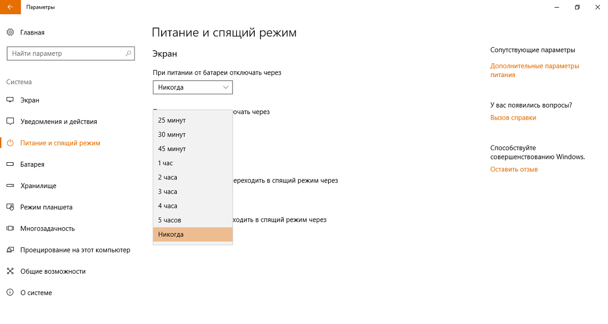 Сейчас в Windows 10 отключить спящий режим можно в разделе Система-Питание и спящий режим. Заходите в него и просто переводите каждую из четырёх опций в режим «Никогда».