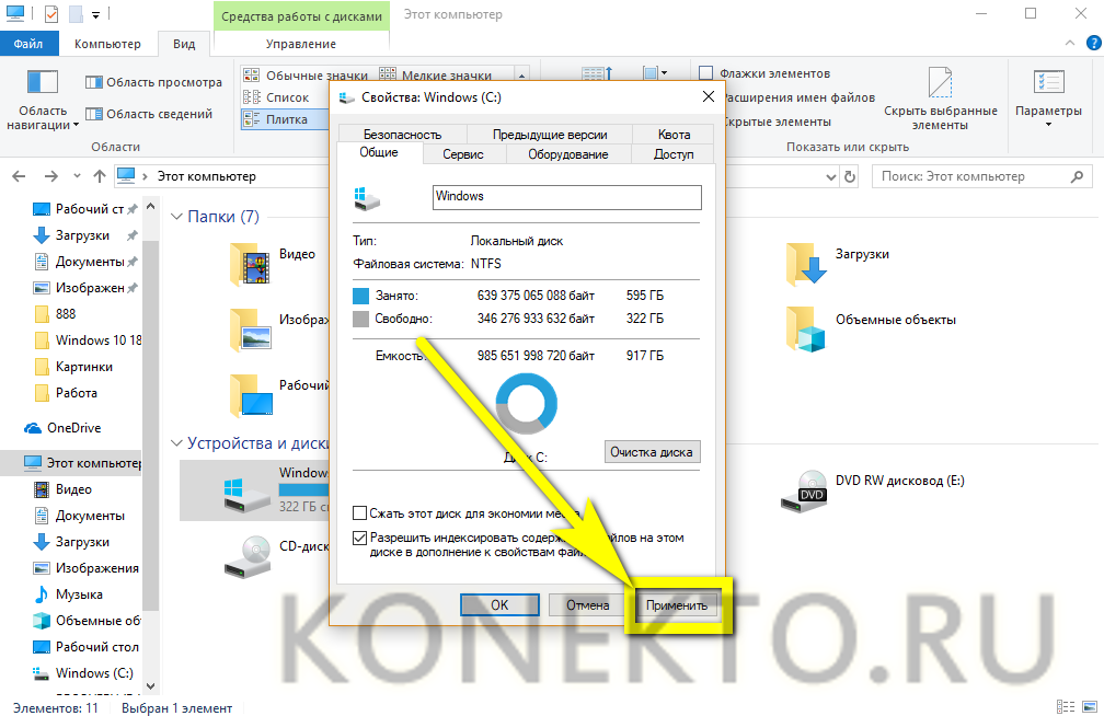 Остаётся нажать на кнопку «Применить», а затем — на «ОК»; пользователь, прошедший путь до конца, убедится, что места на локальном диске стало заметно больше.