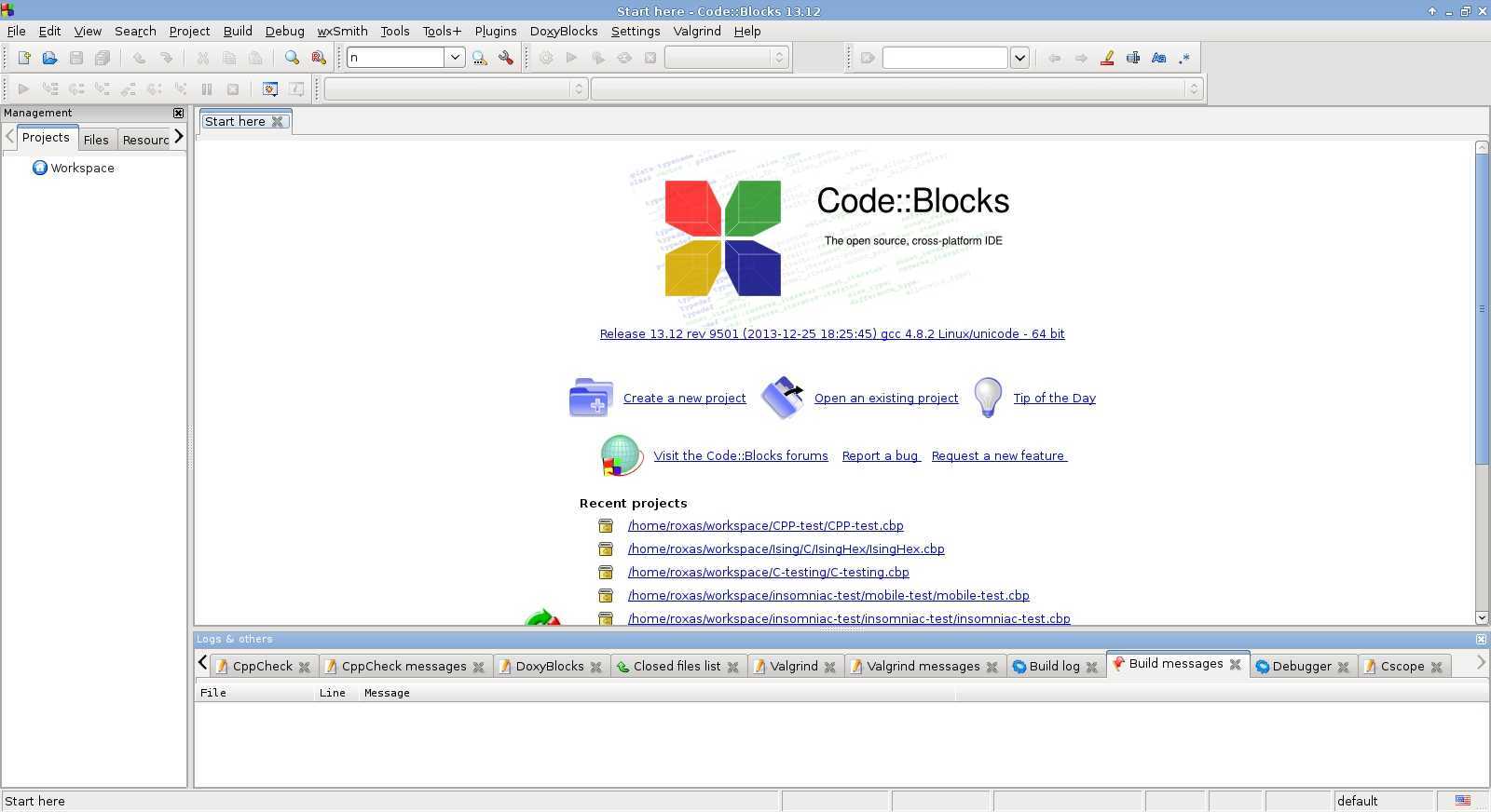Начнем с моего любимого программного продукта, а именно, — простой и быстрой интегрированной среды разработки с поддержкой языков программирования C/C++. Как и в любой достойной интегрированной среде разработки, в ней реализованы подсветка синтаксиса, вкладки, механизмы автодополнения кода и управления проектами, а также интегрирован отладчик. Ее главным преимуществом является простая система плагинов, которая позволяет добавить поддержку таких незаменимых инструментов, как Valgrind и CppCheck, а также реализовать такие менее нужные функции, как мини-игра Тетрис. Мне же она нравится из-за главным образом из-за своего набора очевидных и удобных горячих клавиш, а также большого количества параметров конфигурации, которые могут пригодиться в тех или иных ситуациях.