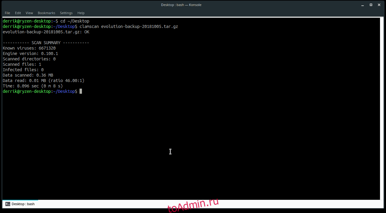ClamAV часто используется для сканирования файловых систем Linux на наличие уязвимых файлов. Еще одно применение ClamAV — сканирование отдельных файлов на наличие проблем. Чтобы отсканировать отдельный файл, запустите clamscan и укажите его прямо на расположение файла.