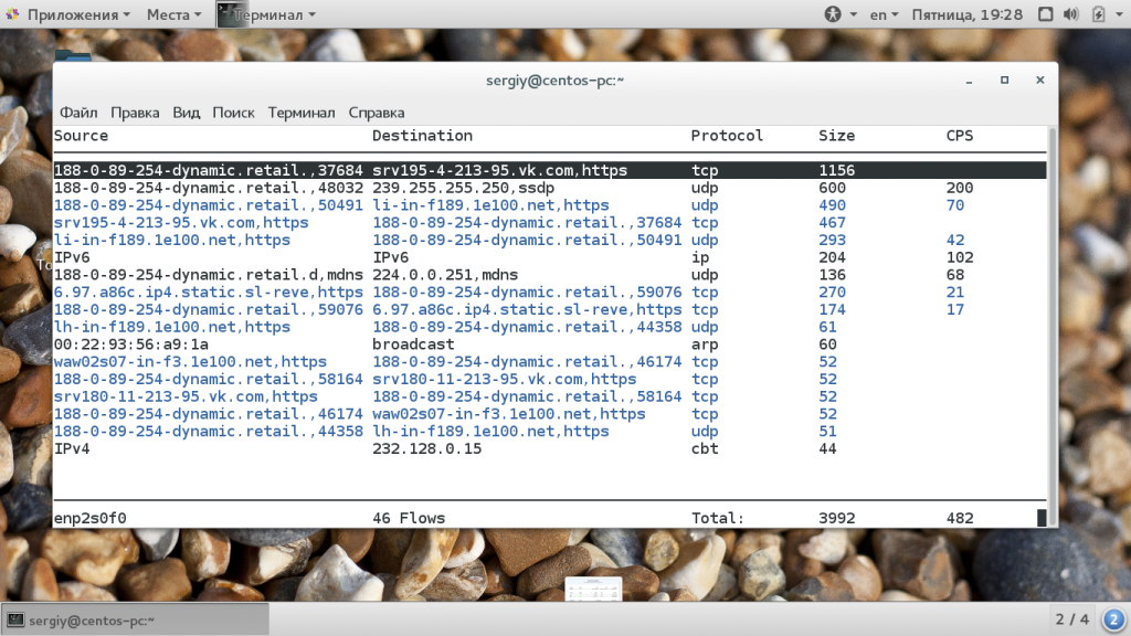 Это утилита, очень похожа на iftop, которая отображает не только скорость передачи, но и сами соединения. Здесь выводится информация по соединениях, размеры пакетов и протокол. Для установки программы наберите: