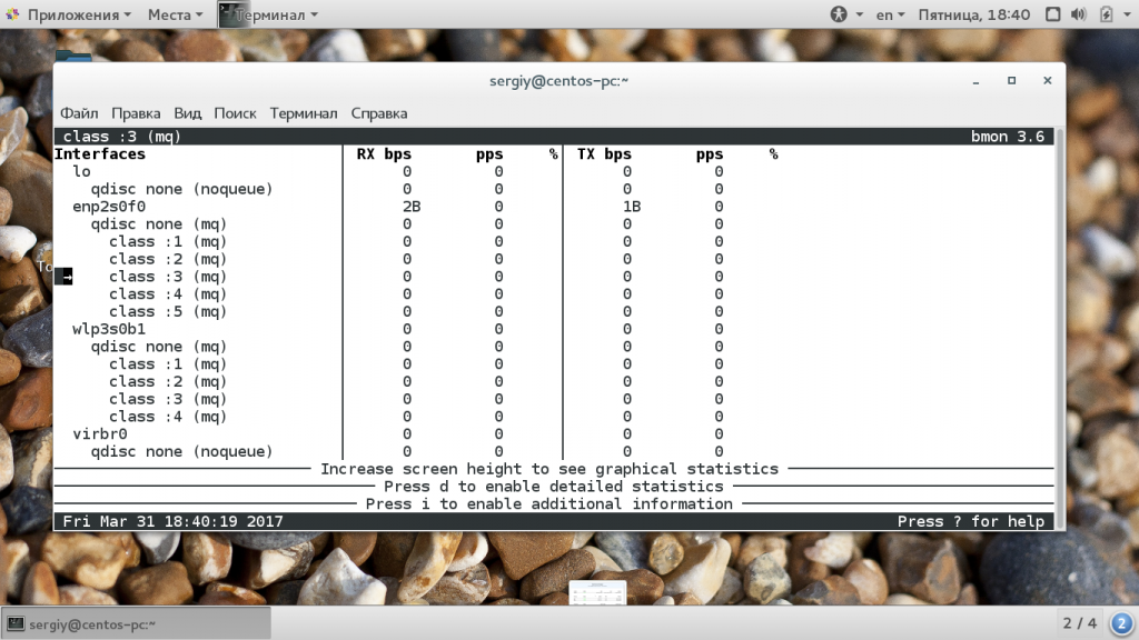 Утилита bmon позволяет отображать достаточно подробно статистику по каждому сетевому интерфейсу. Она работает похоже на nload и выводит график кроме текстовой информации: