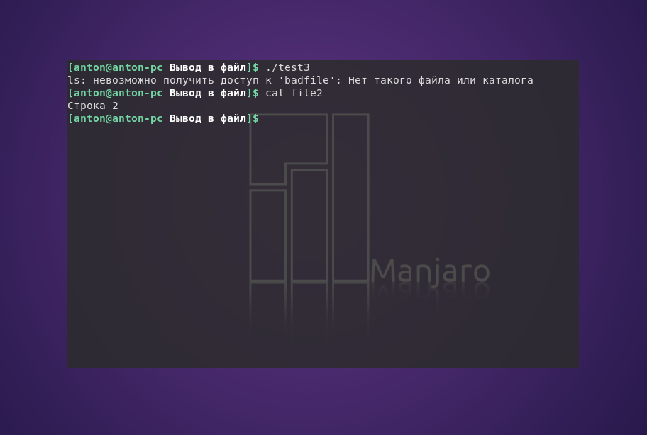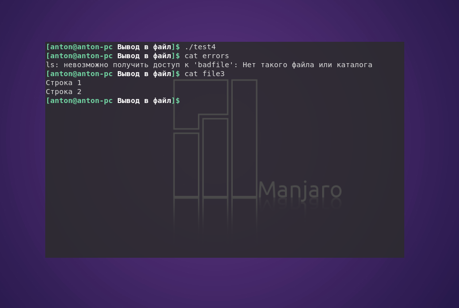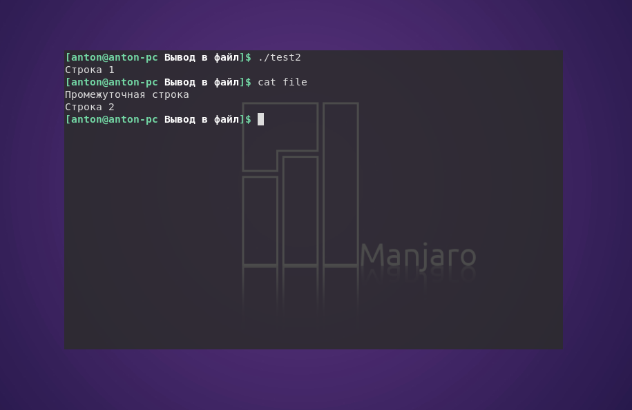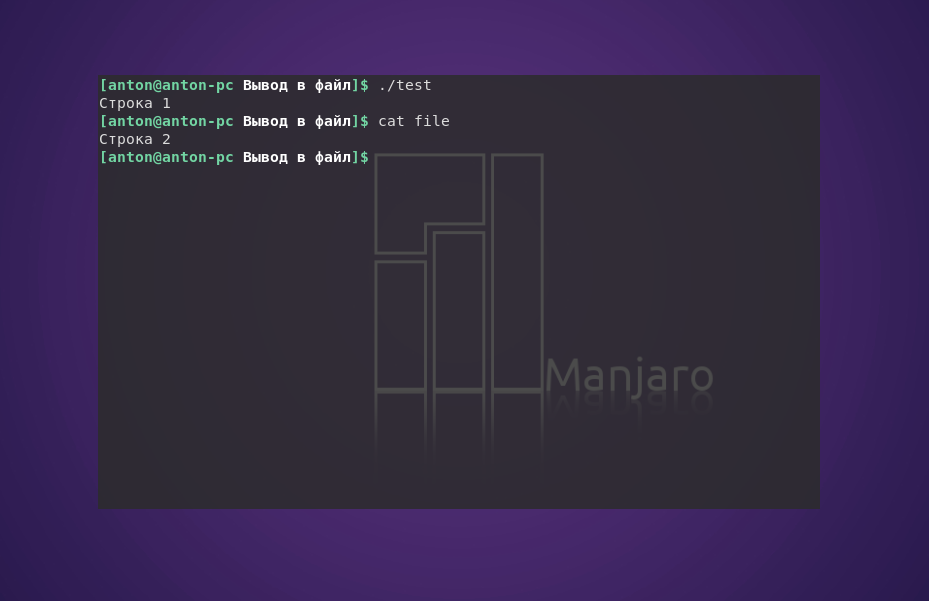 Как результат, «Строка 1» выводится в терминале, а в файл file записывается только «Строка 2»: