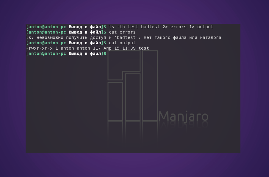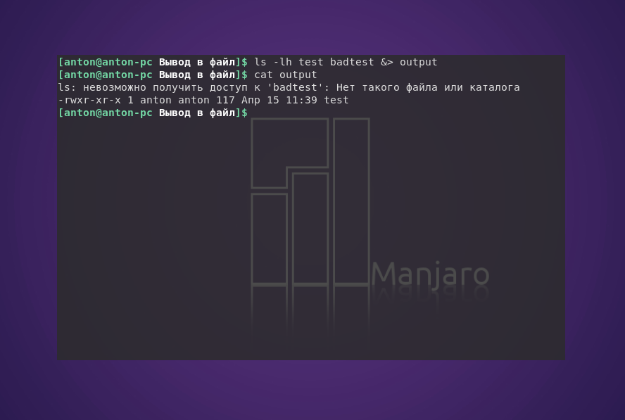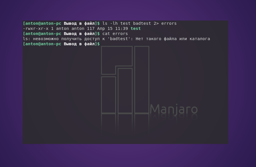 Команда ls попыталась показать наличие файлов test и badtest. Первый присутствовал в текущем каталоге, а второй — нет. Но сообщение об ошибке было записано в отдельный файл.