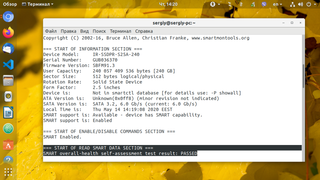 Для отображения информации о конкретном жестком диске (модель устройства, S/N, версия прошивки, версия ATA, доступность интерфейса SMART) Запустите smartctl с опцией info и именем жесткого диска. Например, для /dev/sda: