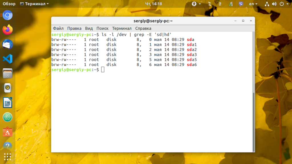 Жёсткие диски имеют особенные названия. В зависимости от интерфейса, через который подключён жёсткий диск, название может начинаться на: sd — устройство, подключённое по SCSI; hd — устройство ATA; vd — виртуальное устройство; mmcblk — обозначаются флешки, подключённые через картридер; В наше время большинство блочных устройств Linux подключаются через интерфейс SCSI. Сюда входят жёсткие диски, USB-флешки, даже ATA-диски теперь тоже подключаются к SCSI через специальный переходник. Поэтому в большинстве случаев вы будете иметь дело именно с дисками sd. Третья буква в имени диска означает его порядковый номер в системе. Используется алфавитная система. Например sda — первый диск, sdb — второй диск, sdc — третий и так далее. Дальше следует цифра — это номер раздела на диске — sda1, sda2.
