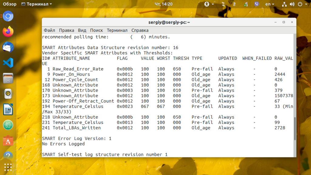 Следующая вещь которую можно посмотреть, когда выполняется диагностика HDD в linux, это таблица SMART атрибутов.