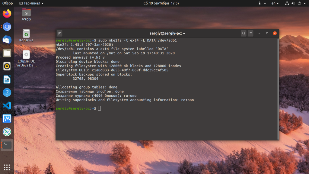Для форматирования мы будем использовать утилиту mkfs.ext4 или mke2fs. Это одна и та же утилита. У неё такой синтаксис: