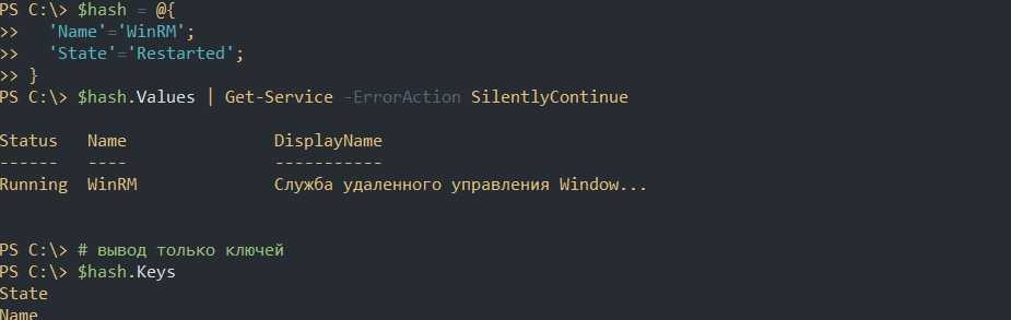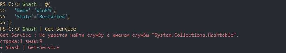 Параметр «ErrorAction» нужен т.к. у нас произойдет ошибка из-за ключа ‘State’. Значения хэш таблицы передаются не как целый массив (как в случае с PSCustomObject), а по отдельности. Сначала передается ключ ‘Name’ со значением ‘WinRM’, а затем ‘State’ со значением ‘Restarted’.