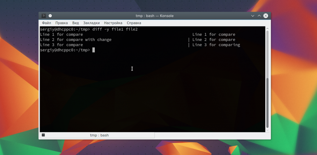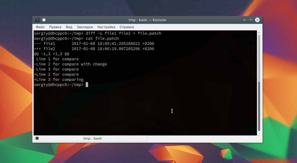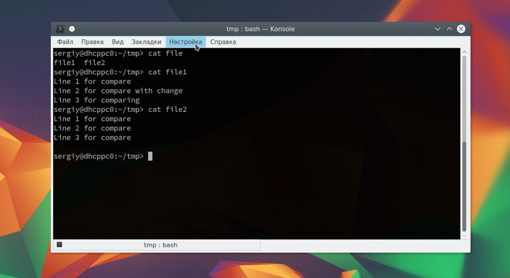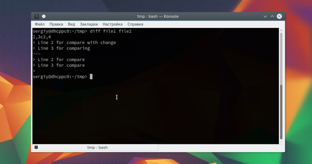 Утилита diff linux — это программа, которая работает в консольном режиме. Ее синтаксис очень прост. Вызовите утилиту, передайте нужные файлы, а также задайте опции, если это необходимо: