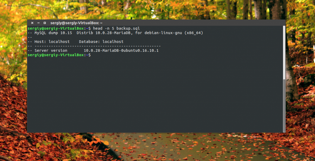 Вам нужно будет ввести пароль пользователя базы данных и больше ничего команда не выведет, поскольку мы отправили все данные в файл, но вы можете посмотреть информацию о резервной копии с помощью такой команды: