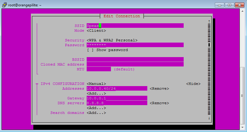 - Войдите в систему и запустите команду «nmtui» для подключения к вашей сети.После подключения к Wi-Fi, если вы решите установить статический IP-адрес, вернитесь в nmtui и отредактируйте соединение, чтобы установить IP-адрес. При настройке суффикса IP-адреса «IP-адрес с / 24» обозначает маску подсети 255.255.255.0