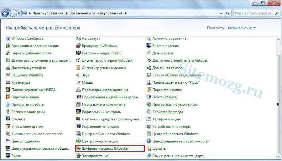 Зайдите в меню Пуск >> Панель управления >> Шифрование диска Bitlocker: