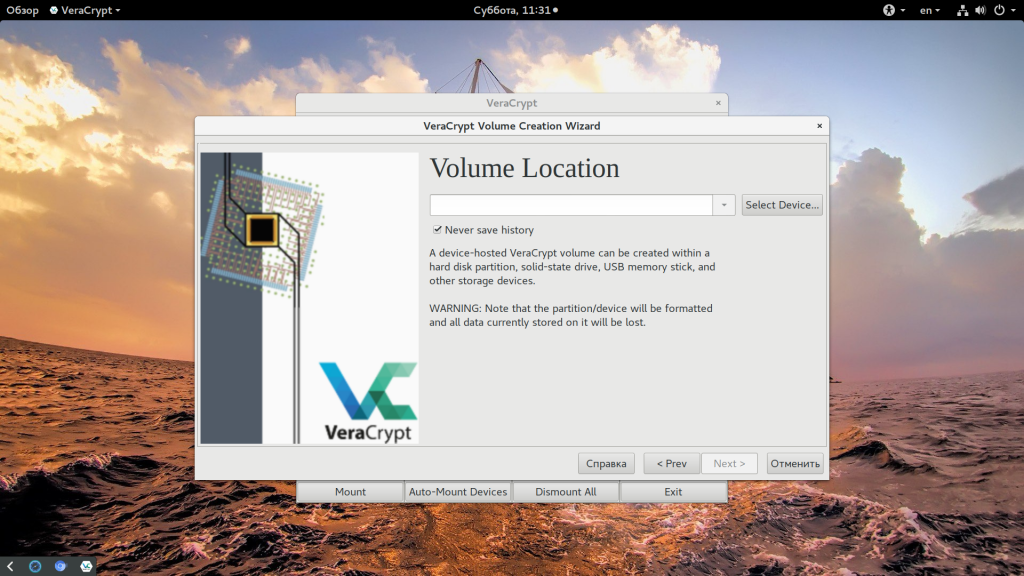 Теперь, когда утилита VeraCrypt установлена в системе, вы можете выполнять шифрование флешки linux или любых других носителей. Перед тем как начать отключите все USB накопители. Этот процесс сотрет все данные на флешке. Пусть нужный накопитель будет подключен но размонтирован.