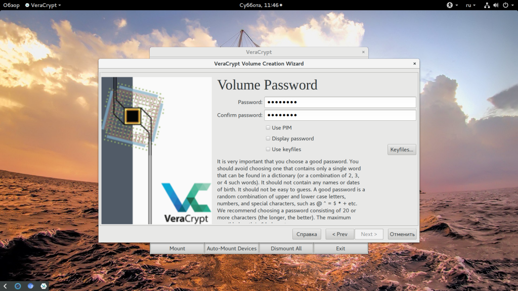 В следующих шагах вы можете настроить параметры пароля и создать аварийный диск, если вы забудете свой главный пароль и хотите восстановить свои данные. При вводе пароля не используйте польские символы — VeraCrypt даже попытается предотвратить это, изменив раскладку клавиатуры на английский, чтобы вы не могли вводить пользовательские символы.