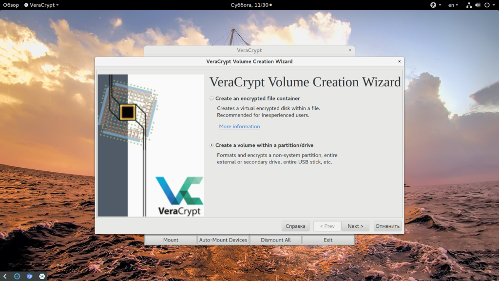 Здесь вы можете создать шифрованный контейнер в файле или же зашифровать целый раздел. Для шифрования флешки нам нужно выбрать второй пункт: