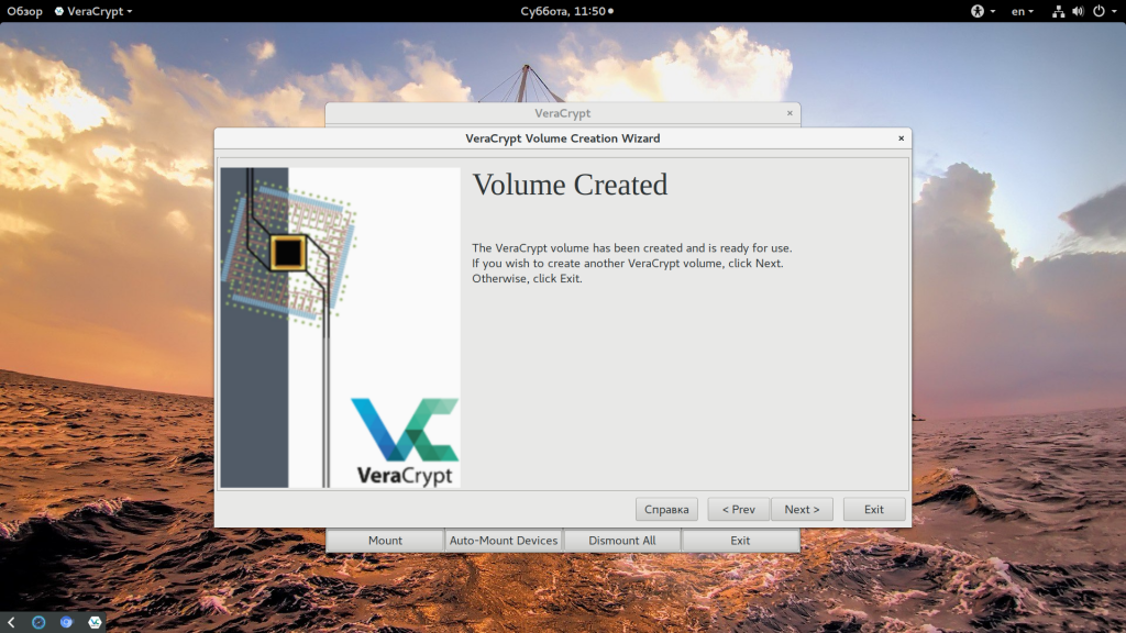 Когда процесс закончится (если конечно Вы не хотите создать еще один том) тыркаем в кнопочку «Выход». На сим наш зашифрованный том готов.