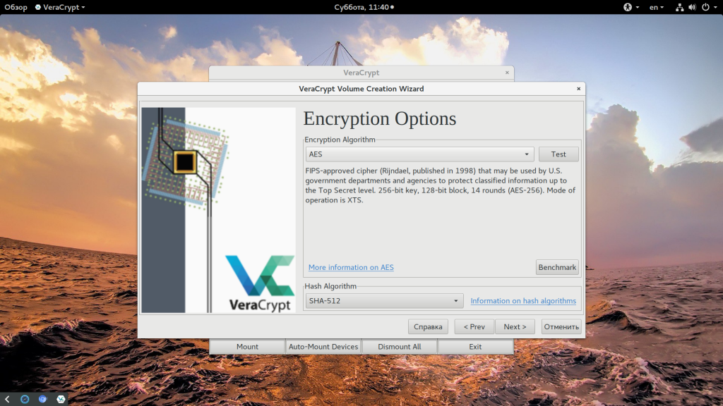 На следующем этапе нужно выбрать какой алгоритм будет использоваться для шифрования. Это очень важный шаг. На данный момент для максимальной безопасности достаточно выбрать AES и SHA512.