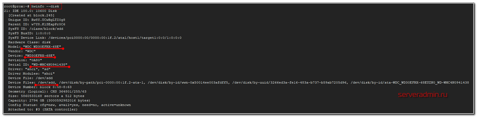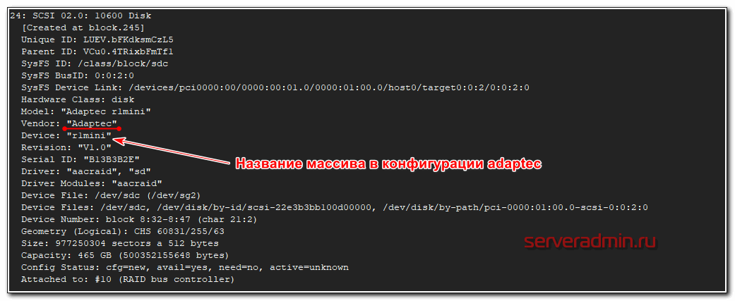На выходе максимально подробная информация о диске — вендор, модель, серийный номер, метки диска в системе и много другое. Программа показывает принадлежность диска к рейд массиву, что бывает удобно. Вот вывод информации о диске из рейда adaptec.
