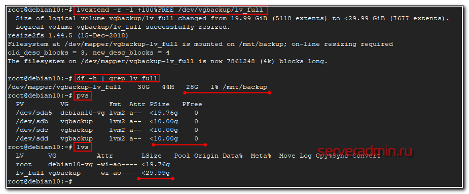 # lvextend -r -l +100%FREE /dev/vgbackup/lv_full