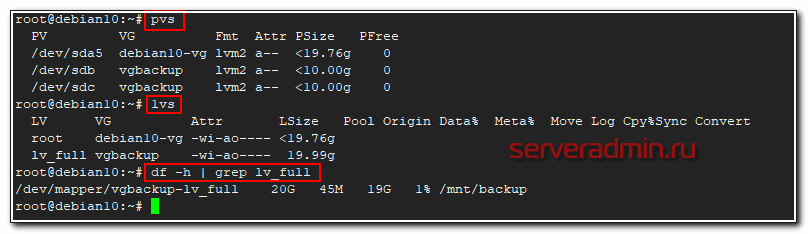 # pvs PV VG Fmt Attr PSize PFree /dev/sda5 debian10-vg lvm2 a-- <19.76g 0 /dev/sdb vgbackup lvm2 a-- <10.00g 0 /dev/sdc vgbackup lvm2 a-- <10.00g 0 /dev/sdd vgbackup lvm2 a-- <10.00g <10.00g