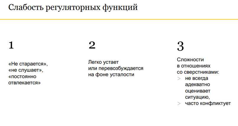На практике СДВГ выглядит так: ребёнок постоянно отвлекается, не слушает, дает импульсивные ответы, чрезмерно активно двигается и устает уже к середине урока. Скорее всего, эти трудности могут быть связаны со слабостью регуляторных функций, за которые отвечают префронтальные отделы лобных долей головного мозга. Головной мозг продолжает активно формироваться в начальной школе. Поэтому если в 3-4 классе динамика поведения ребёнка только отрицательная, педагог может использовать свои тактики обучения для работы с ним, но нужно обязательно рекомендовать родителям обратиться к специалистам — психологам, дефектологам, психоневрологам, нейропсихологам, логопедам.