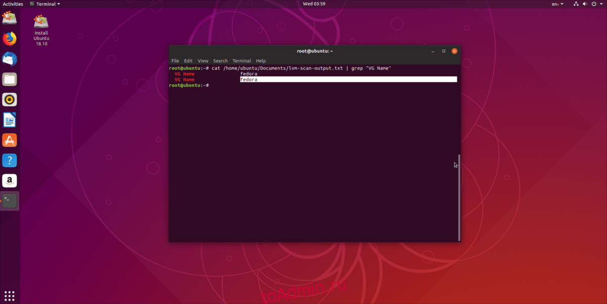 Чтобы удалить активный раздел LVM, откройте терминал и получите root с помощью sudo -s. Затем запустите команду cat в сочетании с командой grep, чтобы отфильтровать имена разделов LV.