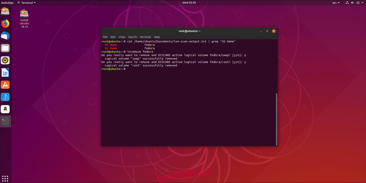 Следуйте инструкциям и нажмите «Y», чтобы удалить каждый раздел LVM из группы томов. Когда команда lvremove завершится, все данные будут удалены с жесткого диска, и у вас останется пустой раздел LVM2. Смело удаляйте раздел с DD.