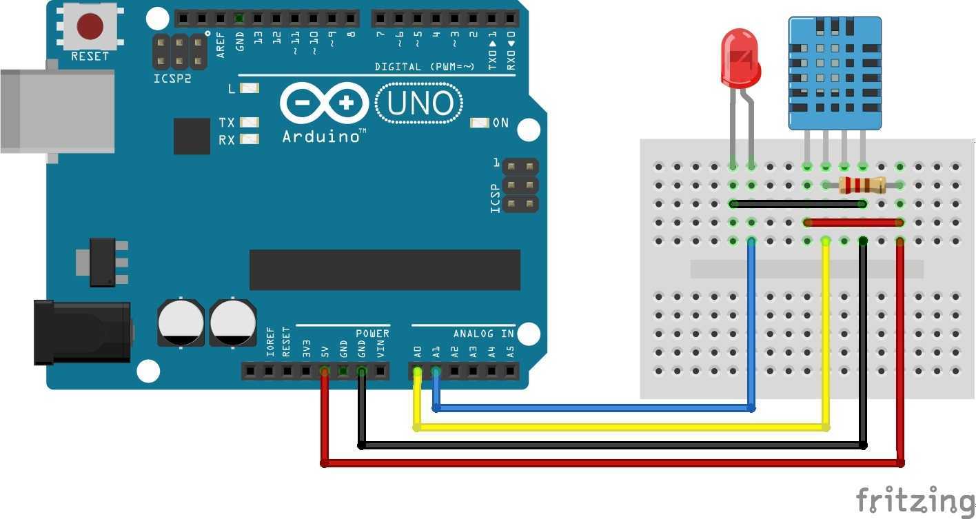 Вот и всё, что касается Arduino. Ниже вы можете увидеть точный код, который написан для этого конкретного случая, с датчиком DHT11 и светодиодом.