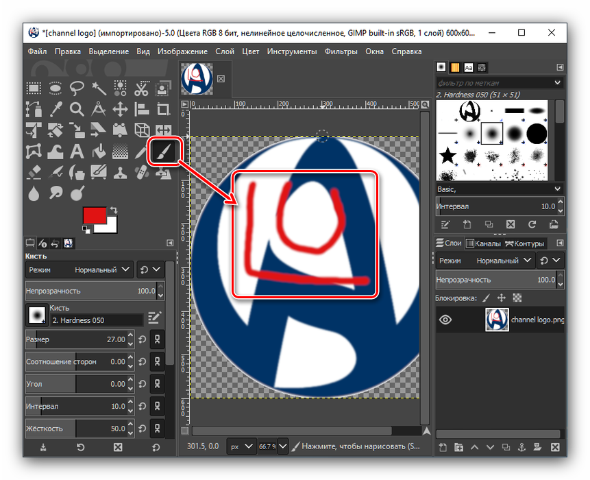 Чтобы воспользоваться функциями рисования рассмотрим левую панель инструментов. Здесь расположены кисти, карандаши разных параметров. Карандаш издает резкие штрихи, кисть – плавные мазки.