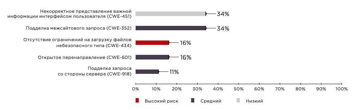 Треть веб-приложений оказались уязвимы для атаки типа Clickjacking (содержали уязвимость «Некорректное представление важной информации интерфейсом пользователя», CWE-451) и столько же для атаки «Подделка межсайтового запроса» (Cross-Site Request Forgery, CSRF). В ходе CSRF-атаки злоумышленник с помощью специально сформированных сценариев может выполнять действия от лица пользователя, авторизованного в уязвимом веб-приложении