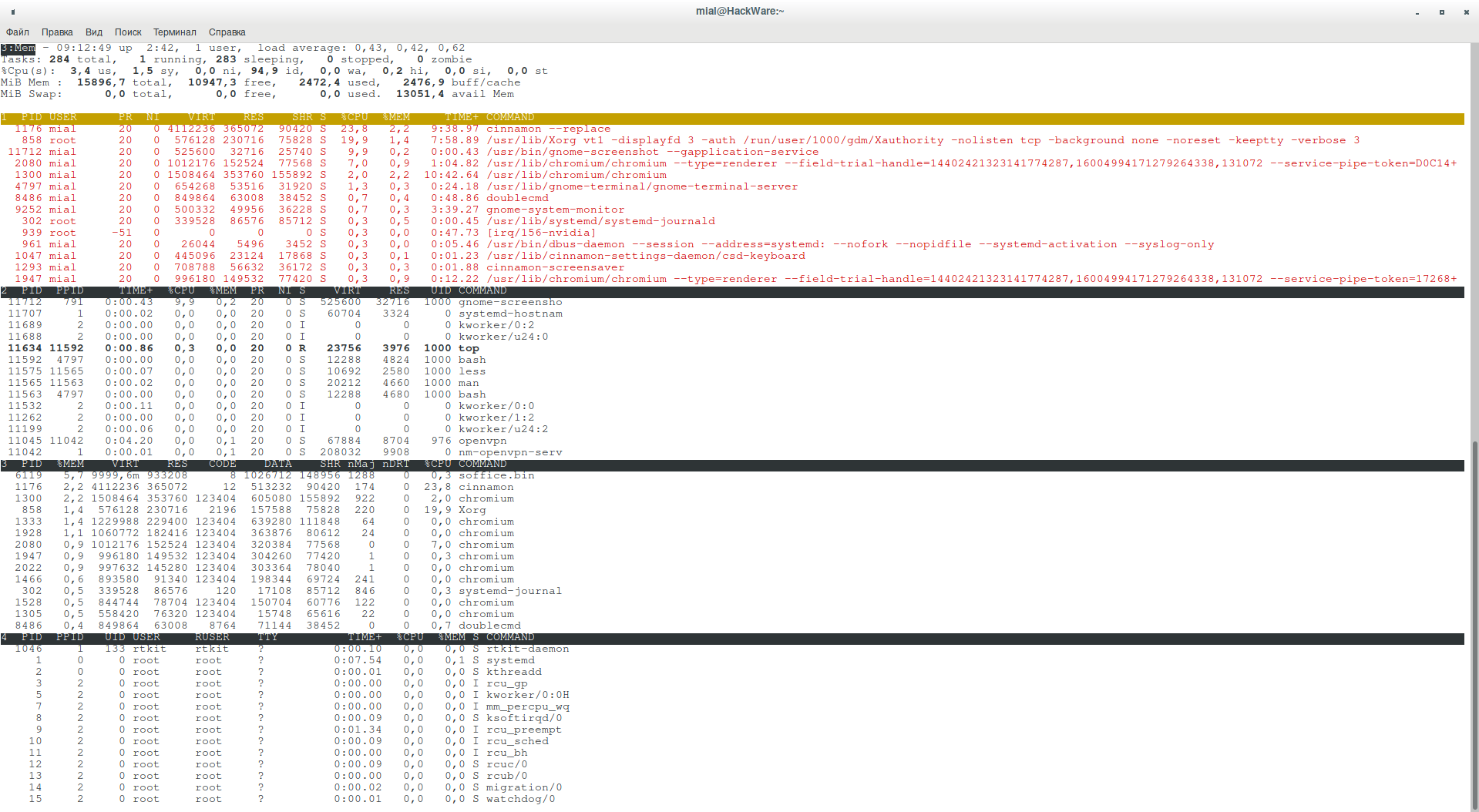 Программа top поддерживает работу с несколькими окнами — до четырёх. Причём в каждом из них можно сделать совершенно разные настройки и наблюдать за различными характеристиками системы.