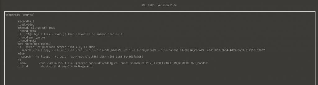 В данном случае, корневой раздел имеет имя /dev/sda5. Именно это имя можно передать ядру в конфигурации загрузчика Grub, а можно UUID, но если в этом нет крайней необходимости, то короткое имя использовать гораздо проще. Надо перезагрузить компьютер, в меню Grub выбрать нужную загрузочную запись и нажать клавишу E: