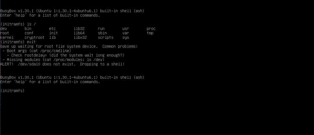 Alert: /dev/sda10 does not exist. Dropping to a shell