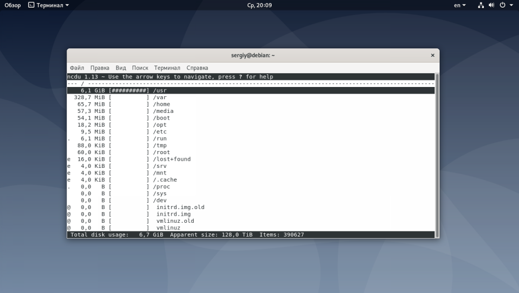 Первая отбирает файлы, размер которых исчисляется в мегабайтах, а вторая — в гигабайтах. Кроме того, вы можете воспользоваться утилитой ncdu. Но её надо сначала усстановить: