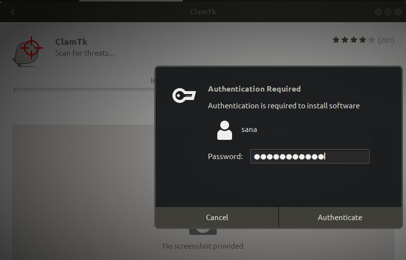 Система предложит Вам с Диалогом аутентификации. Программное обеспечение будет удалено, когда Вы предоставите пароль sudo пользователю и нажмете Authenticate на диалоговое окно.