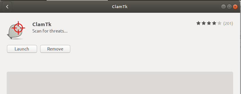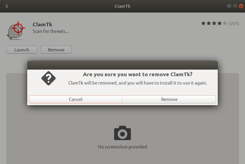 Откройте Ubuntu Software Manager и ищите ClamTK. Вы будете видеть состояние “Installed” в поисковой записи. Нажмите эту запись и затем нажмите Remove от следующего представления: