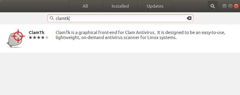 Нажмите значок поиска и введите ClamTK в панель поиска. Результаты поиска перечислят соответствующие записи следующим образом: