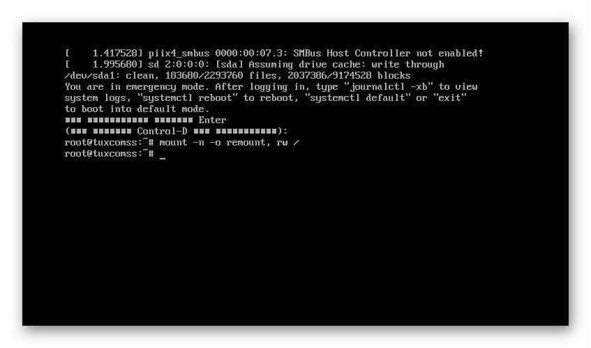После того, как вы добавили «systemd.unit=emergency.target», нажмите Ctrl + x или F10, чтобы продолжить загрузку в аварийный режим.