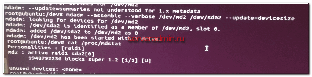 # mdadm --assemble --verbose /dev/md2 /dev/sda2 --update=devicesize