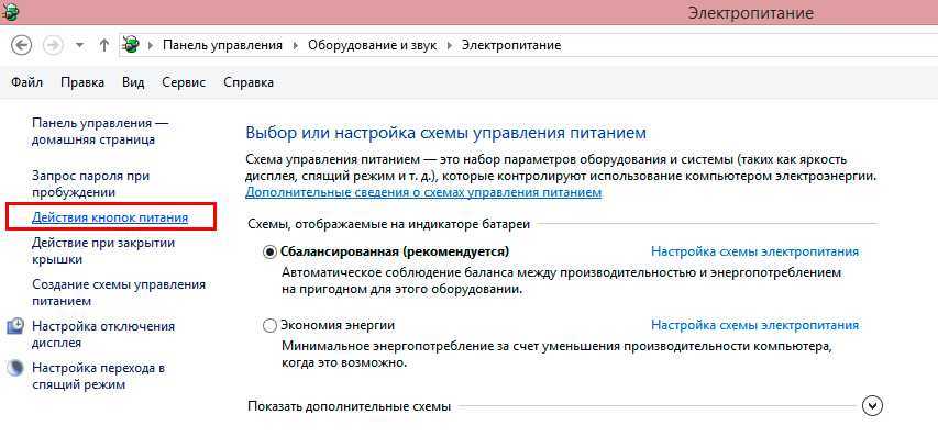 Теперь перед вами откроется окно с множеством функций и возможностей, связанных с электропитанием. С левой стороны будет находиться пункт «Действия кнопок питания», наведите на него мышку и кликните по нему.
